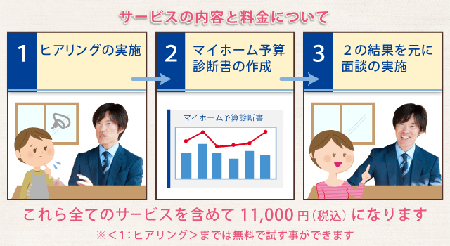 まずは初回の相談(無料)であなたの家計の状況や将来のお考え、お悩みなどをお聞かせいただきます。サービスをご利用であれば料金11,000円(税込)をいただきます。次回の面談の際に「マイホーム購入予算診断書」を受け取ることができます。